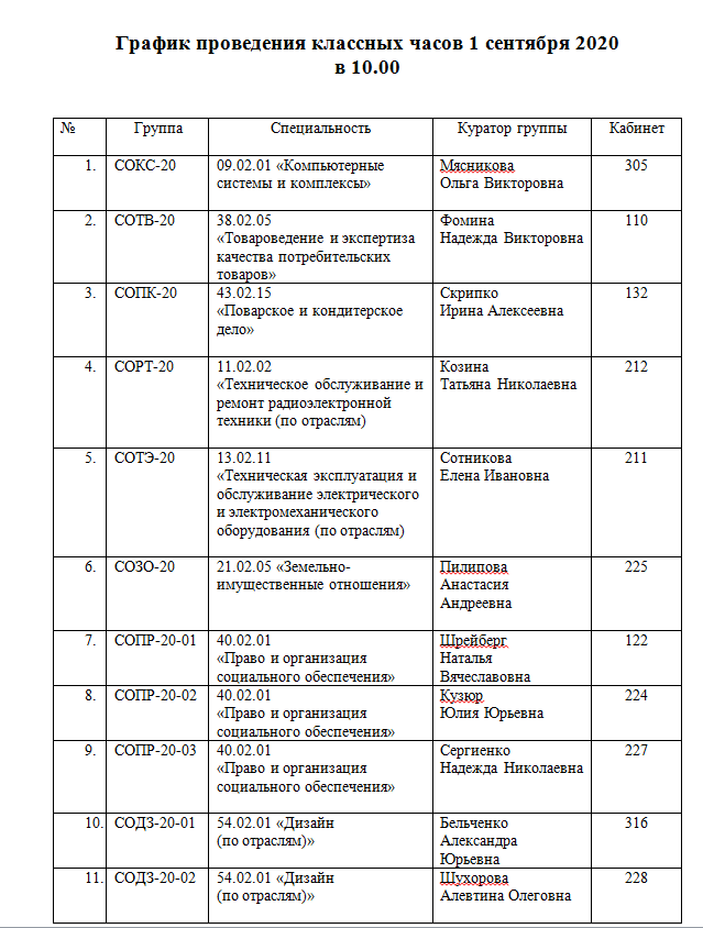 График проведения классных часов 1 сентября.